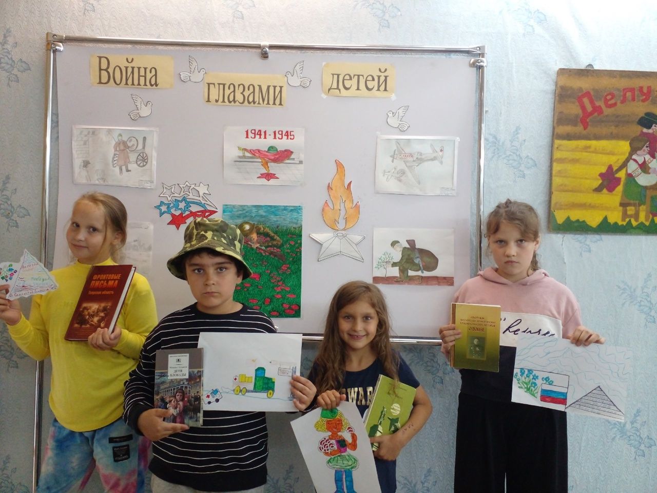 11 августа в пункте выдачи книг  прошли громкие чтения » Память о войне нам книга оставляет «, посвященные Году защитника Отечества и 80-летию Победы в Великой Отечественной войне. Дети читали вслух стихотворения и отрывки из рассказов о войне В.Быкова, М.Сухачева и других.  Прочли письмо-треугольник, написанное с фронта. Нарисовали рисунки на тему: «Война глазами детей «.
